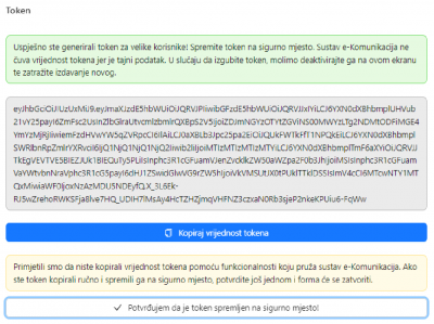 Token kopirajte klikom na plavi gumb Kopiraj vrijednost tokena, spremite ga (Paste/Zalijepi, CTRL+V) u Notepad ili Word, te nakon toga kliknite na Potvrđujem da je token spremljen na sigurno mjesto: