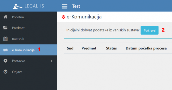 Odabirom e-Komunikacija (1) u lijevom izborniku otvoriti će se ekran na kojem treba pokrenuti inicijalni dohvat podataka (2):