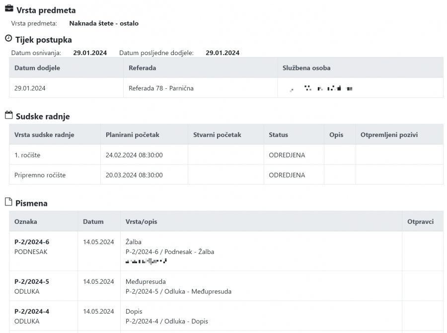 - izmjene na predmetima (npr. dodjela pisarnice, promjena sudionika, itd.)