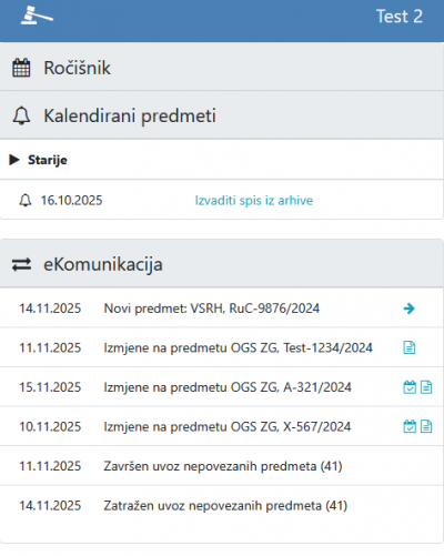 Opciju za mobilni pregled Kontrolna ploča (Dashboard) nudi sve bitne informacije u obliku prilagođenom za mobitel - radnje i kalendirane predmete u idućih nekoliko dana, te novosti po predmetima iz e-Komunikacije. Sami pregled sadrži sve bitne informacije o aktualnim Ročištima i novostima iz eKomunikacije: