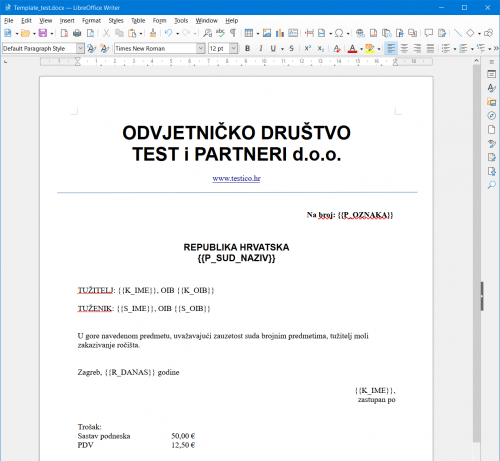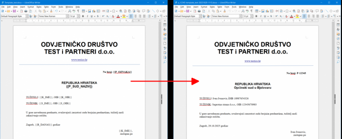 U aplikaciji Legal-IS kreiranje Predložaka dokumenata je vrlo jednostavno - uzmete neki od svojih postojećih dokumenata i promijenite ga tako da na odgovarajuća mjesta stavite oznake Polja iz Predmeta: