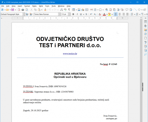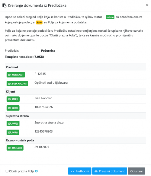 Polja za koja nema podataka možete ostaviti u dokumentu i ručno ih izmijeniti nakon preuzimanja - ili paljenjem opcije “Obriši prazna Polja” dobiti rezultat da u dokumentu nema oznaka za Polja za koja nema vrijednosti. Klikom na [Preuzmi dokument] završna verzija dokumenta će biti ponuđena za preuzimanje (download). Taj preuzeti dokument sadrži popunjena polja: