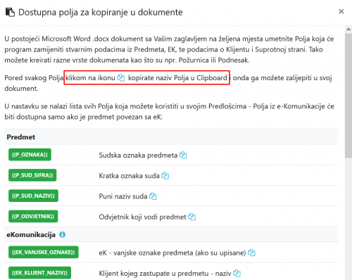 Sva imena Polja su dostupna klikom na [Dostupna Polja] te ih od tamo možete kopirati u svoj dokument klikom na ikonu za kopiranje: