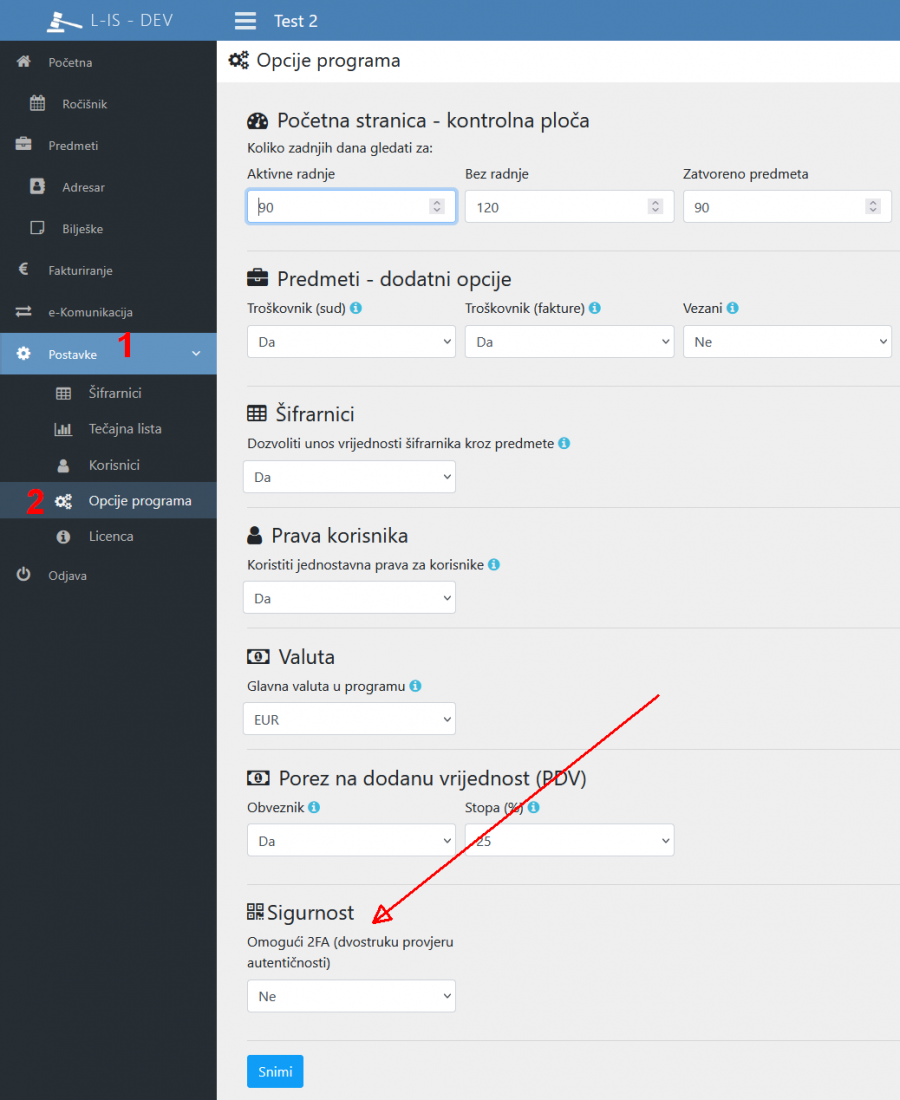Za uključiti globalno 2FA za sve korisnike, korisnik sa Administrativnim ovlastima treba otvoriti Postavke (1) i odabrati Opcije Programa (2). Pri dnu stranice nalazi se opcija gdje opcijomo “Da” omogućite korištenje 2FA i Snimite izmjenu.