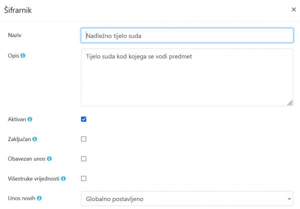 To znači da će ponašanje svih šifrarnika na kojima je “Globalno postavljeno” biti određeno onim kako je podešeno u Postavke → Opcije programa tj. da će biti dozvoljen upis novih vrijednosti kroz masku za unos predmeta. To je preporučeno podešavanje jer je tako korisnicima jednostavnije upisivati nove vrijednosti koje ne postoje u šifrarnicima - alternativno, osoba sa korisničkom rolom F će prvo trebati upisati nove vrijednosti u šifrarnike. Niže je opisano kako administrator šifrarnika održava takve novo upisane vrijednosti šifrarnika.